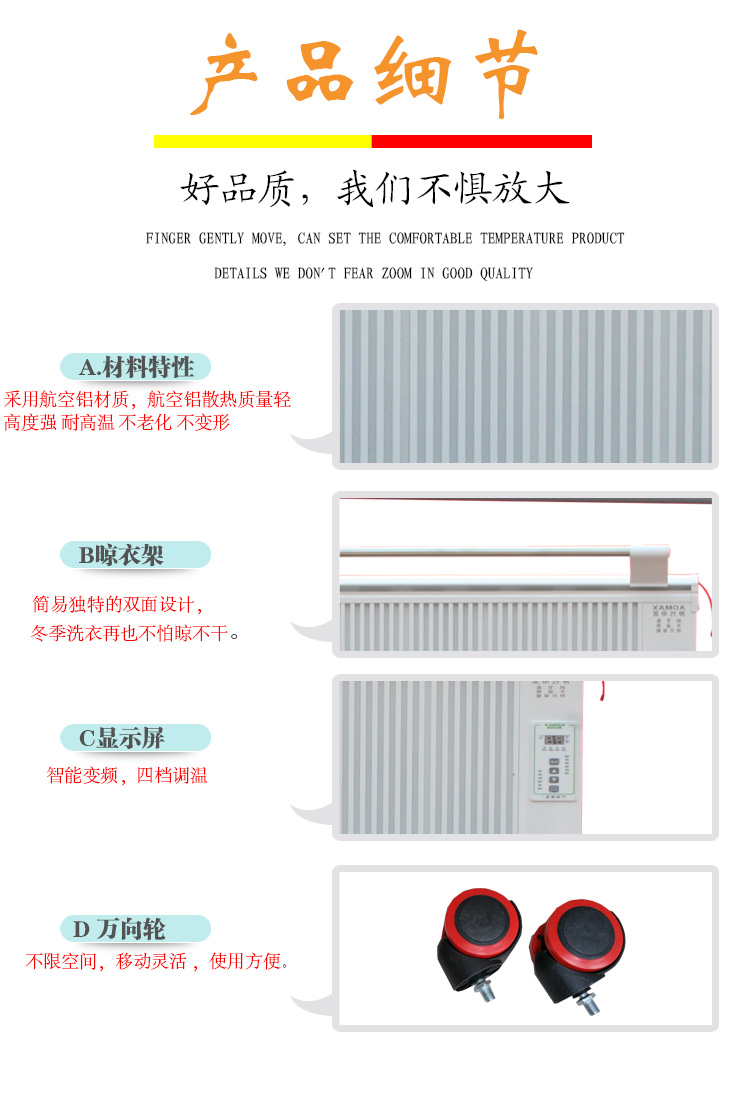 碳晶電暖器具有體積小重量輕、造型美觀大方、結(jié)構(gòu)堅(jiān)固耐用,無(wú)需增加任何配件,可隨意變換移動(dòng)使用位置等特點(diǎn)。發(fā)熱體,可隨意移動(dòng),任意放置,且可隨意攜帶,是家用采暖的創(chuàng)舉。
